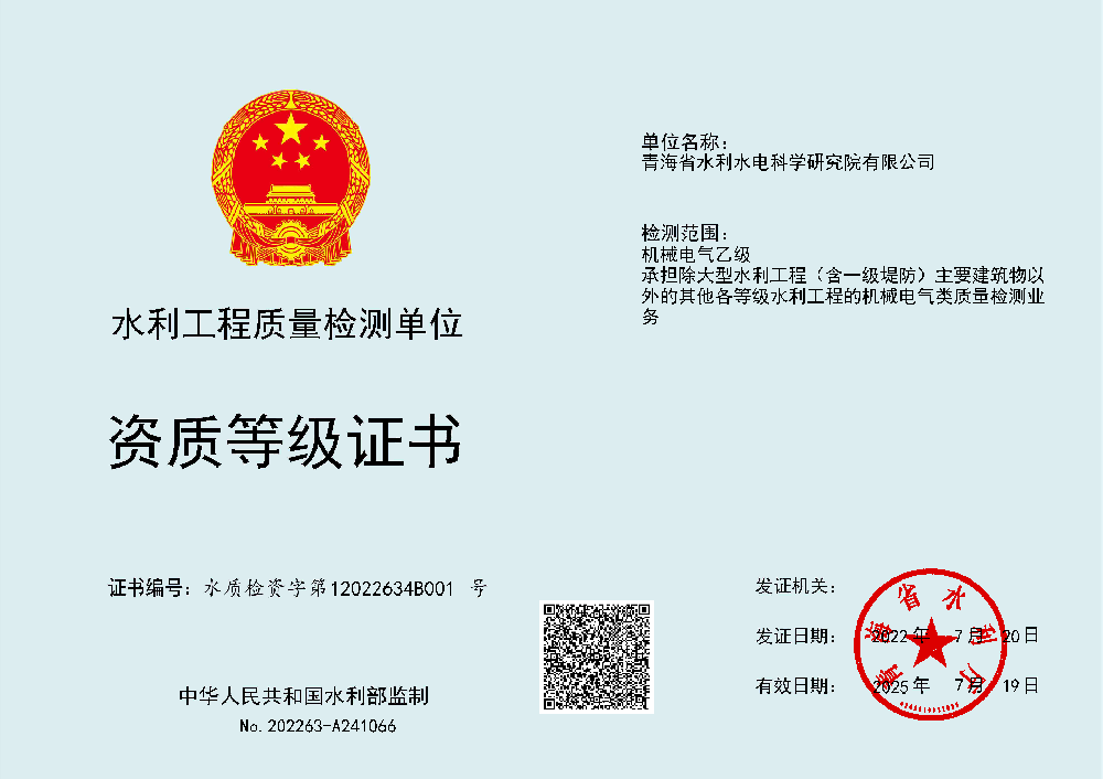 • 水利工程質(zhì)量檢測單位資質(zhì)等級證書(機(jī)械電氣類)